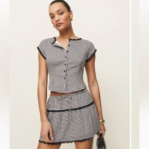 Big romance. Shop the Valetta Two Piece from Reformation, a two piece set with a button front top and a matching mini length skirt.