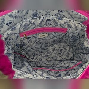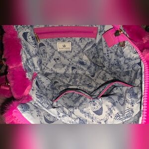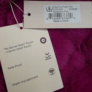 BRAND NEW, LUXURIOUSLY SOFT, GORGEOUS OLIVER THOMAS: Convertible/ Multiwear Vegan Fluffy Fur Raspberry Pink Tote with Matching Clip-on Interior Zipper Pouch, Internal zip up stash pocket, and 2 open top internal compartments.