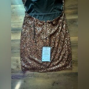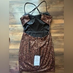 Shine all night in this gorgeous City Studio sequin bodycon dress, brand new with tags from Macy’s! Perfect for homecoming, a cocktail party, holiday events, or even a trip to Vegas. The brown/rose-gold ombré sequins shimmer beautifully under the lights, while the strappy open-back design and front slit add a flirty touch.