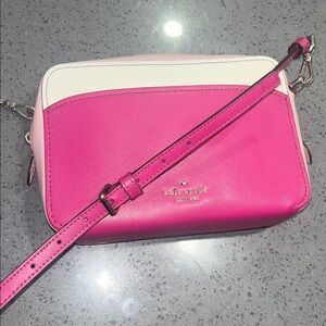 Elegant Kate Spade crossbody with a bold fuchsia and cream color scheme. Ideal for a stylish touch. This is a pre-love item and may show light signs of wear