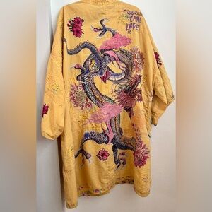 Wrap yourself in the artistry of Magnolia Pearl with this Dragon Romani Kimono Jacket. Crafted in European cotton and adorned with vivid appliquΓ©s, hand-patched details, and exquisite dragon embroidery, this kimono is a true statement piece. Each Magnolia Pearl garment is uniquely distressed and hand-mended, ensuring no two are ever the same.