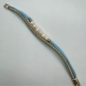 Freshwater Pearl & Clear Rhinestone Blue Leather Wrap Bracelet 6.5” Magnetic
