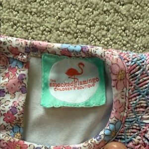 Pictures don’t do this bubble romper justice. The fabric is SO SOFT. Adorable floral baby romper with a ruffle collar. Features a pink and blue floral pattern. The Smocked Flamingo. Like new! Size 6m