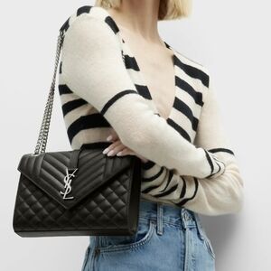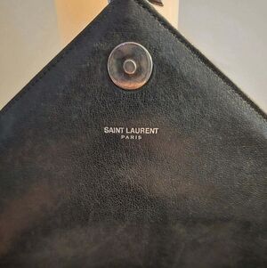 Hardware: The bag features a prominent YSL logo on the front flap and a chain shoulder strap, with gunmetal-tone hardware.