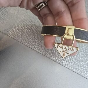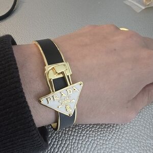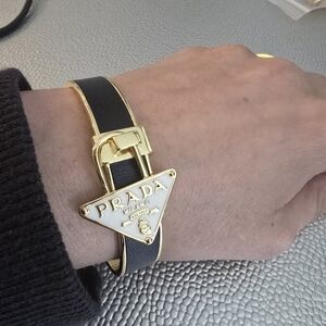 18kgp Elegant Prada bracelet featuring a sleek black band and luxurious gold accents. Perfect for adding a touch of sophistication to any outfit. can't confirm authenticity as it's a gift and priced accordingly. item is stamped. stunning peice and adjustable