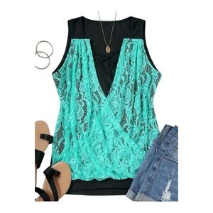 NWOT Black and Green Sleeveless Blouse with Cut Out Tie Front