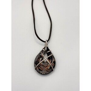 Black, Silver & Gold Art Glass Teardrop Pendant Necklace With Cord Dichroic