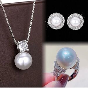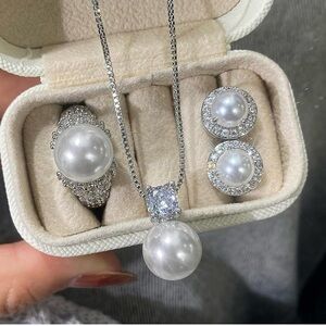 ❤️Elegant Aesthetic Jewelry Set -Women Pearl Necklace Earrings & Ring NIB Gift