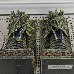 Intricately designed dragon bookends. Features detailed scales and fierce expressions. Perfect for fantasy lovers.