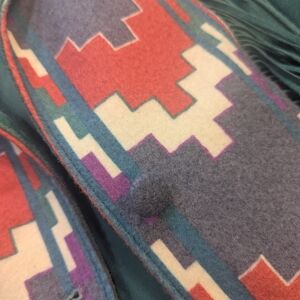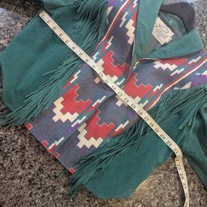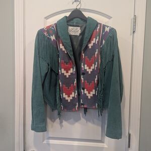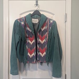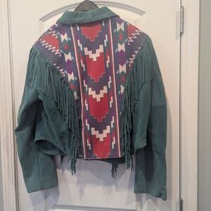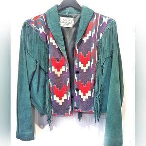 Vintage Lariat Women's Green Suede Leather Fringe Jacket Rodeo Western Cowgirl Aztec design.