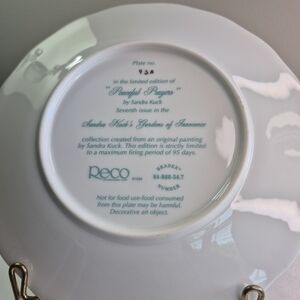 Decorative Angels porclain plate gold trim. Collection Garden of innocence Sandra Kuck 'Peaceful Prayer' 7th issue numbered #93A. All measurements are approximate measurements: 8 x 8 inches. No cracks no chips. Plate stand not included. Excellent condition.