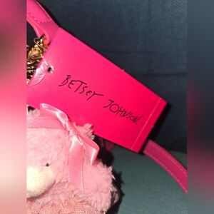 Betsey Johnson handbag or crossbody in vibrant pink. Adorned with a plush bear charm. Eye-catching and fun accessory.