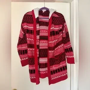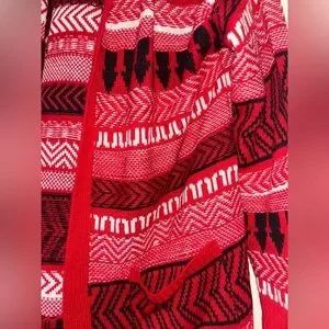 Bold red and black cardigan with intricate patterns. Open front design. Perfect for layering.