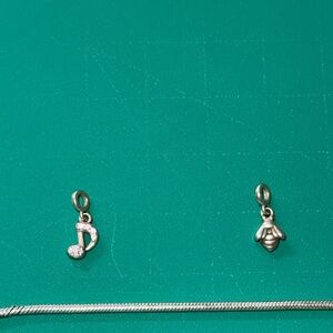 Elegant pandora silver bracelet size 8” with five unique charms. Features colorful accents for a vibrant look. Last picture shows a little kink at the end of the bracelet. Not noticeable. Perfect for any occasion. I added a pandora box. BRACELET NOT INCLUDED!!