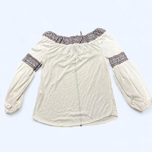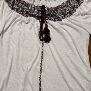 Chic white blouse featuring detailed brown embroidery and tassel! This is super cute and even has a tie that u can tighten or losen on the chest! Ideal for a sophisticated look. Perfect if you’re going for a Boho look! This does say size small however it is stretchy! Can definitely fit a M!