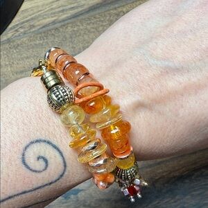 This stunning wrap bracelet features a blend of gold and orange beads, perfect for adding a touch of elegance to any outfit. The intricate design and warm colors make it a versatile accessory for any occasion. Measures approximately 12”- 15”in adjustable. Handmade by jrsdesignsltd in Maine with ❤️