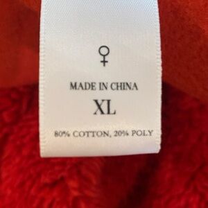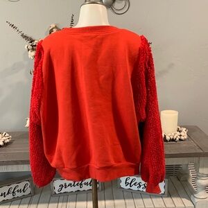 Bold red pullover with soft, plush sleeves. Ideal for a warm, stylish look.