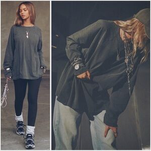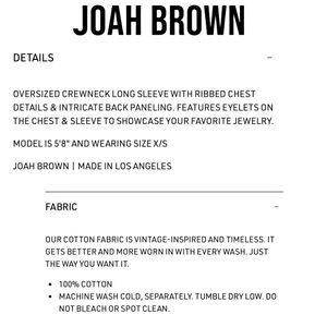 JOAH BROWN Vintage Panel Oversize long sleeve Charcoal Necklace Shirt in size X-Small, brand new with tags - never worn or washed. This sick top features an oversized fit, long sleeves, fun stitched paneling as shown in the pictures above, crewneck, pull on style, interior JB tags intact, JB logo on one sleeve as pictured and the coolest part is there are holes in the front of the shirt to pull your necklaces through. Awesome top, brand new and cool style. No trades, best offers usually accepted via the offer button.