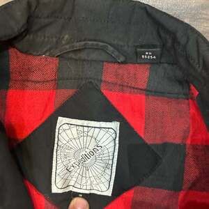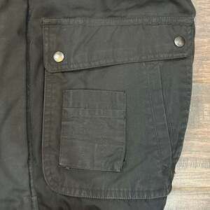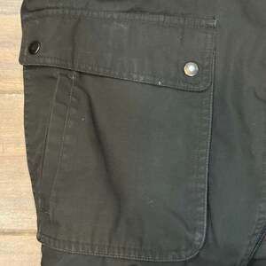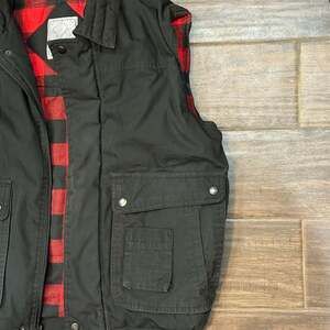 Vintage Expeditions Men's Vest, Size Medium, perfect for hunting, fishing, or casual wear. This black utility vest features a black. plaid flannel lining for warmth and comfort. Equipped with multiple cargo pockets, including button-flap pockets and smaller slip pockets, offering ample storage for essentials. The robust design and classic flannel interior make this a versatile layering piece. Excellent pre-owned condition with no significant flaws. Shell is 60% cotton and 40% polyester. Lining is 100% cotton.