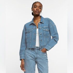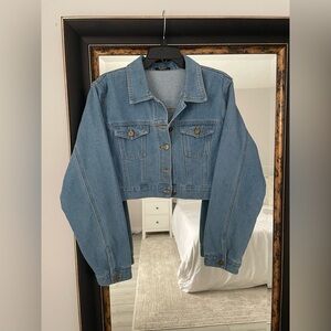 Stylish blue jean jacket. Classic design with button closure. Perfect for casual wear.