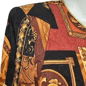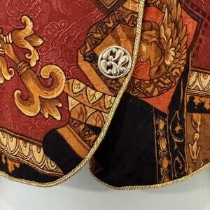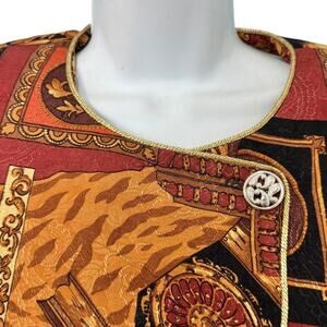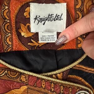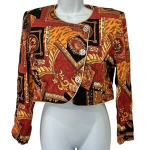 Vintage 80s–90s cropped blazer by Knights Ltd, tagged size 10 (fits modern M). Black, red, gold, and orange filigree pattern with gold piping along the edges and swirl buttons. Features a 3-button asymmetrical front, integrated shoulder pads, and a structured silhouette. Made in the USA from 100% rayon. Unique statement piece that pairs perfectly for evening or art-inspired looks.