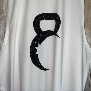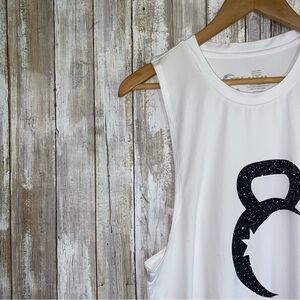 Stay stylish and comfortable with this white sleeveless top featuring a bold black kettlebell design. Perfect for casual outings or workouts.