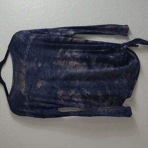 Elevate your style with this chic tie-dye long sleeve top. Perfect for casual outings, this top features a unique side tie detail. The deep blue color adds a touch of elegance to your wardrobe. 22 sleeve 21 lenght 26