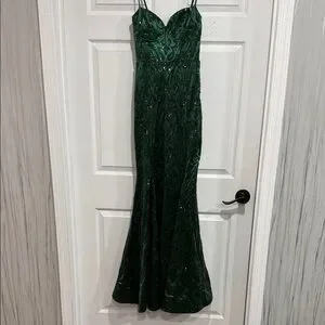 Chic maxi dress with a deep green hue. Features a fitted bodice and elegant straps. Perfect for formal events.