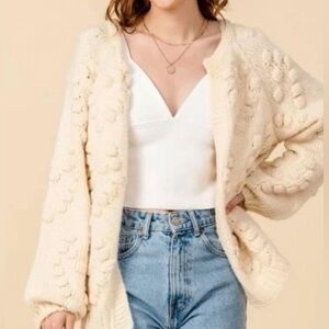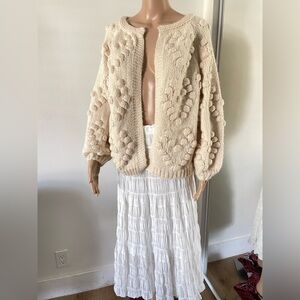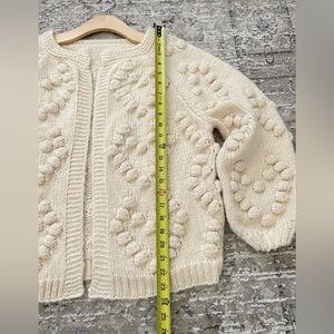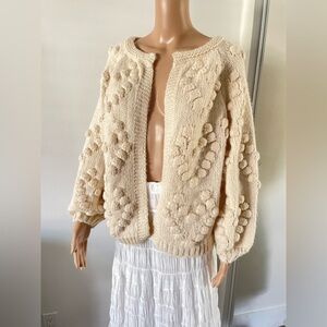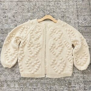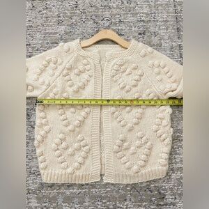 Anthropologie Style Chunky Pom Pom Heart Cardigan Sweater Puffs Size M Cream