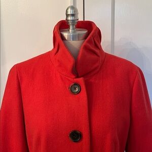 Beautiful Coral pink/red wool coat. Classic lines and fit. Collar is cute up or down. See photos for measurements. Smoke free, cat free home. Sad to part with it but it doesn’t fit me.