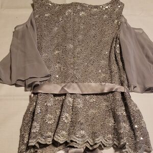 This exquisite blouse showcases a shimmering sequin design with flutter sleeves, offering a touch of elegance. The gray and tan hues are beautifully complemented by a stylish tie front, making it a versatile piece for any occasion. Its embellished details add a sophisticated flair to your wardrobe.