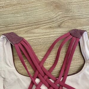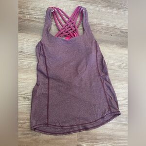 lululemon Wild Tank Built In Bra Heathered Black Cherry/Electric Coral - draping, open back tank - built-in strappy bra - Seriously Light Luon: sweat-wicking , four-way stretch - added Lycra for shape retention - Silverscent technology powered by X-STATIC inhibit odor-causing bacteria - low armholes - slim fit - shelf bra (no pads) - medium coverage , hip length - size 2 Pre owned, clean . Good Condition.