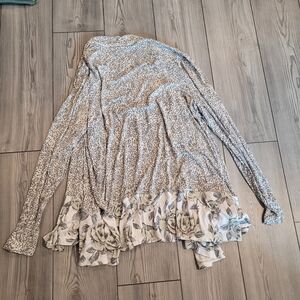 Chic gray cardigan with floral trim. Lightweight and stylish. Perfect for layering.