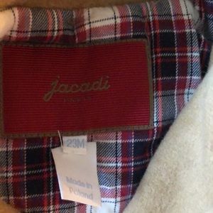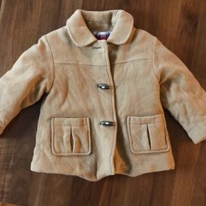 Stylish tan pea coat by Jacadi. Features button closure and front pockets. Perfect for cool weather.
