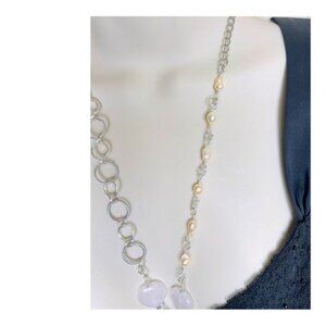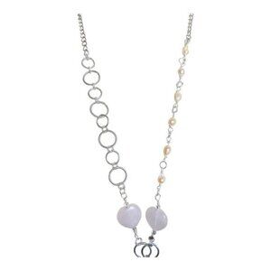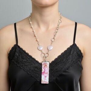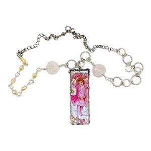 In an era where love stories were penned with the elegance of ink, this necklace captures the essence of vintage romance. The encased Valentine's card, adorned with cherubic imagery, is cradled in glass and silver blend metalwork. Pink quartz and freshwater pearls weave a tale of timeless affection, whispering memories of heartfelt exchanges.