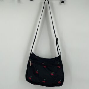 LeSportsac HTF Red Cherries Embroidered Shoulder Bag Purse Clean Black