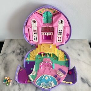 In good used condition. Comes with 4 people, doors all open, bed blanket rises. Missing one lion statue. I do not believe the people are original to this set, but still fun. Large Polly pocket.