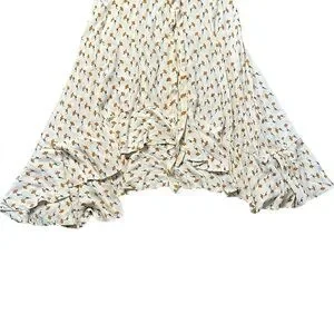This elegant maxi skirt by Faithfull the Brand features a flowing A-line silhouette with a high-low ruffled hem, perfect for resort wear. The cream and brown tones create a subtle geometric pattern, adding a touch of sophistication to its lightweight, airy fabric. The tie front detail enhances its casual yet chic appeal, making it a versatile addition to your wardrobe.
