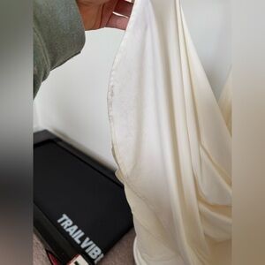 Worn once for 4 hours. Small dot on sleeve and minor staining on very bottom hem. GORGEOUS on!
