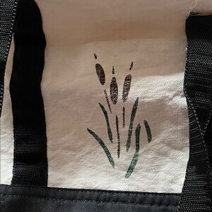 Spacious and sturdy 17β x 12β x 4β canvas tote featuring a charming silkscreen design of ducks and reeds. Durable webbed handles are sewn into a reinforced black bottom panel for extra support. Two outer side pockets add convenience. Excellent used conditionβminor undone stitching on one handle top (purely cosmetic, does not affect strength or function).