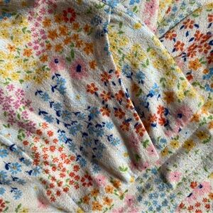 This Cuddl Duds Women's Pajama Set in Peach Multi Color Floral Print features a stylish V-neck top with short sleeves and a button detail for a cute and comfortable fit. The cropped pants in a matching multi color floral pattern with pockets and a pink drawstring accent add a playful touch to the Capri-style set, making it perfect for the summer and spring seasons. Made from a blend of polyester and spandex, this machine-washable knit set is a cozy and stylish choice for lounging around the house. Feels like soft flannel with a cute ruffle hem around the sleeve and pant legs. Worn once for a wedding glam up.