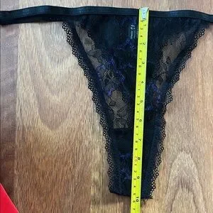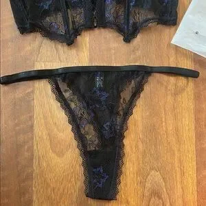 This exquisite black and blue lace lingerie set offers a perfect blend of elegance and allure. Designed for comfort and style, it's a must-have addition to your intimate collection. This is a size large set! Comes with tags and original packaging. Purchased off of Amazon. Approximate measurements on the panties are 15 inch elastic waist and 10 inches from waist to bottom of panty. The top is adjustable with the string in the front and the hook and eye in the back. The measurements at the very smallest is 15 inches pit to pit and 16 inches from top to bottom. As always, smoke and pet free home. Same day shipping! Willing to negotiate prices I absolutely love the glitter blue in this absolutely stunning.