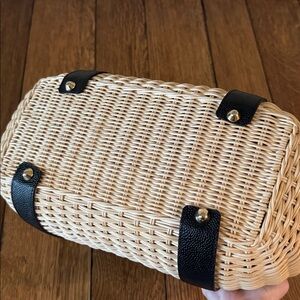 This stylish woven tote bag features a classic black and tan design, perfect for any occasion. Its elegant look and durable construction make it a must-have accessory.