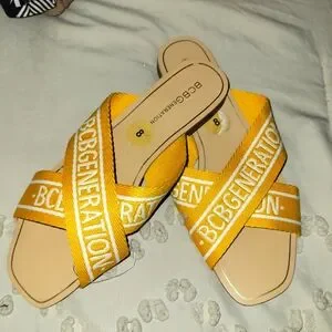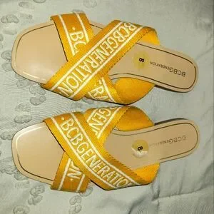 Mustard sandals with bold crisscross straps. Features BCBGeneration logo.