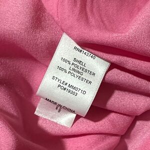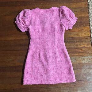 Chic pink dress with textured fabric and button-up front. Features puff sleeves for a stylish look.