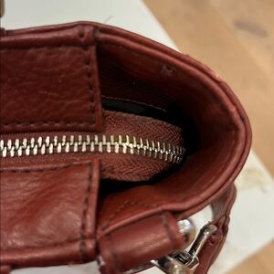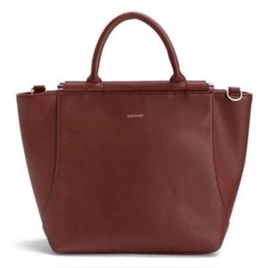 Chic Matt & Nat sustainable vegan leather satchel in a deep red hue. Colour called “Koala”. Features sturdy handles and a detachable strap. Ideal for everyday use. Zip top. interior zip pocket. In excellent condition inside and out.