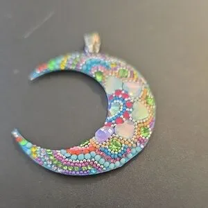 Add a touch of whimsy to your outfit with this colorful crescent moon pendant. Featuring a vibrant mix of blue, green, purple, and pink hues, this piece is perfect for any occasion.