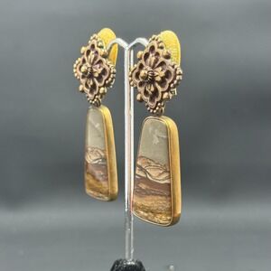 Elevate your jewelry collection with these striking 2.5-inch clip-on earrings by renowned designer Stephen Dweck. Crafted from a harmonious blend of bronze and sterling silver (925), these earrings showcase intricate floral motifs paired with faceted black onyx stones, reflecting Dweck's signature fusion of natural elements and sculptural design.