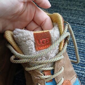 Stylish UGG sneakers with a blend of brown, blue, and orange. Comfortable and durable for everyday wear.