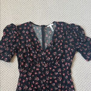 Chic black dress with red floral print. Features an asymmetrical hem and puff sleeves. Ideal for stylish outings.